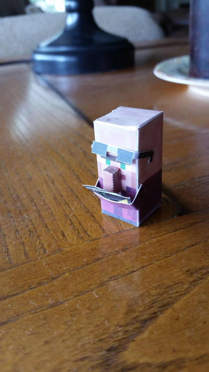 Ok, this will be long, but you need to read all of it. I made this villager, I'm going to put him in lots of stop motion movies and pictures. So here is his backstory. He used to live in a lonely village in the middle of the desert. One day he decided to go exploring with two other villagers. Eventually, they came across a jungle and found a MASSIVE temple. They ventured inside. It was filled with traps. The three villagers bypassed all the traps and got to the very center of the temple. There turned out to be an entire civlization inside. Of pigmen. I don't mean ZOMBIE pigmen, I mean living ones. Those pigmen turned out not to be very happy about the three villagers invading their village. The three villagers got to the main building and discovered an emerald idol inside. The villager in the picture grabbed it. It turned out to be trapped as well. It spilled gallons upon gallons of lava into the room. The villager in the picture escaped with the idol (Like Indiana Jones!) But, the other two were a bit slow. This is why villagers love emeralds so much. In doing this, he discovered that he loves colecting things and loves collecting trading cards. But by now you are probably wondering why I've not addressed the villager by name yet. WELL THAT'S THE PROBLEM! I can't think of a name for him! SO, I NEED YOUR HELP. I'm going to do a thing where you comment a name for this great villager, and I'll choose the one I like most and NO I'M NOT GOING TO CALL HIM PROFESSER POPPINGTON.