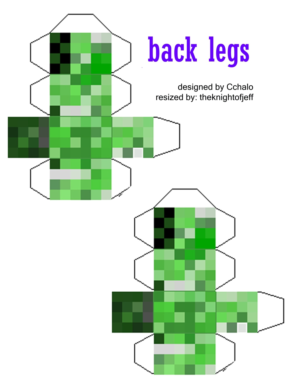 This is my creeper, original design by: Cchalo; Resized by me. He is 8 inches tall. And thanks to 12donuts his legs should now be fixed!