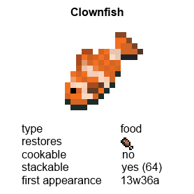 this is the clownfish! its a new fish from the 13w36a snapshot! it doesnt do anything good, only half a hunger.