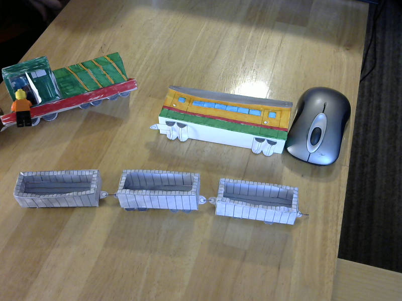 a mini-sized train that looks like the one in the train & zeppelin mod. drill a hole in a connector and put one staple end in the hole and bend the extra on the bottom up to make the connectors. that's how the cargo cars stayed together. and normal minis (which excludes tall golem minis) can fit inside. same thing with legos. and yes, the lego man knocked the train over as i took the picture. after I've made two more different cars, i'll add those too. hope you enjoy!