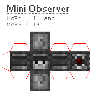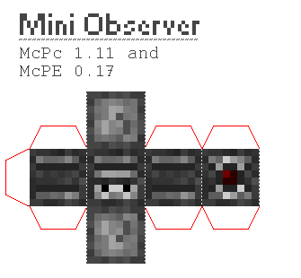 As you know well from teh label about who posted this, I'm Scrillrock and here is the new Observer block texture from Minecraft PC 1.11 and (probably) from the upcoming Minecraft PE 0.17 / 1.0 version on a Mini block. It's pretty much only a cosmetic change, so for more information about the function of this redstone component, check out my previous versions --> http://www.pixelpapercraft.com/papercraft/57567f89011983e32116a754/mini-observer