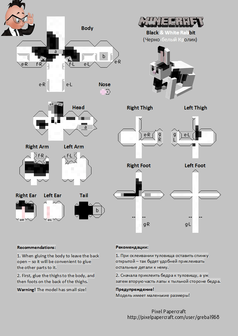 Лист формата А4, дизайн не стандартный - по 10 пикселов в нарисованном пикселе (стандарт - 8 пикселов), при распечатывании получается ширина головы 14 мм. Детали очень мелкие, толщина носа - 1 мм. Удачи!