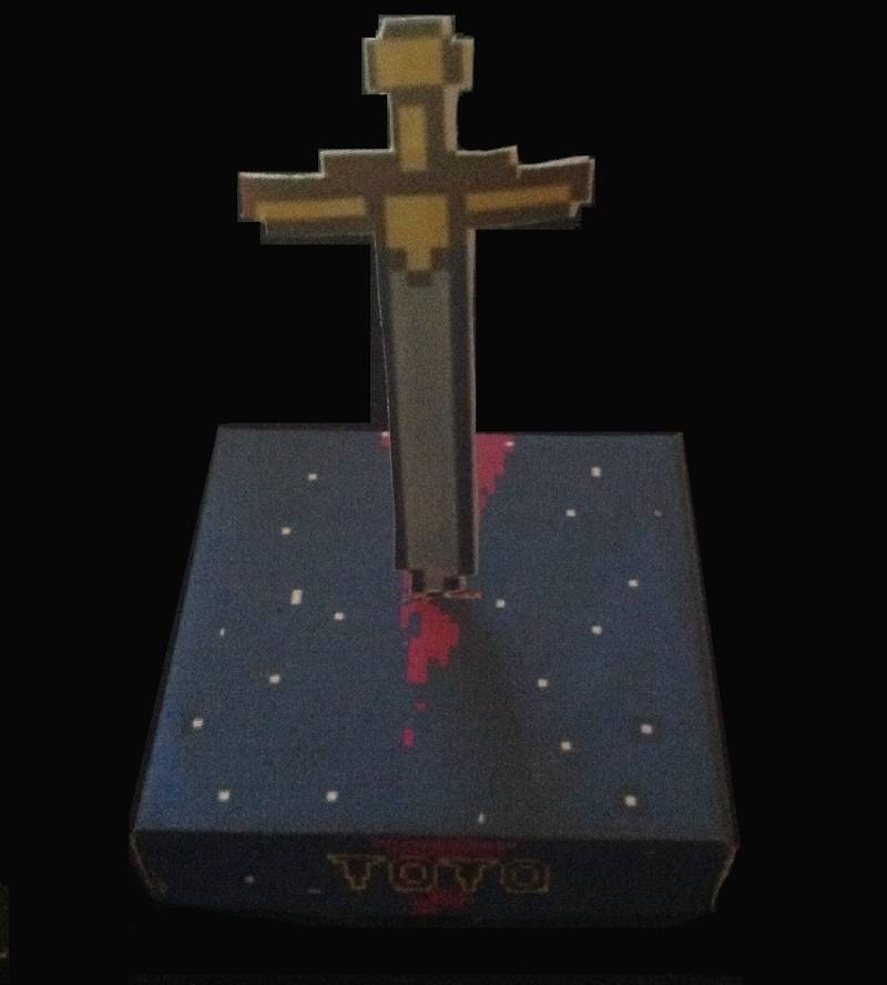 This papercraft sculpture is based of the iconic Toto sword, originally designed for their 1977 album by Philip Garris after listing to Toto's "Manuela Run" the double-edged sword is an iconic part of the image of Toto being featured on many Toto albums.