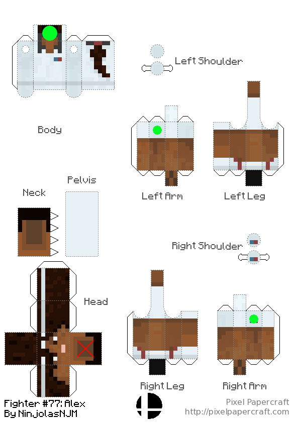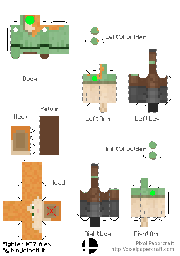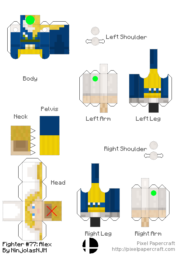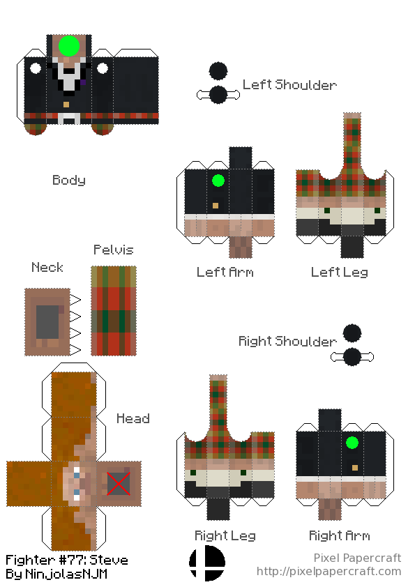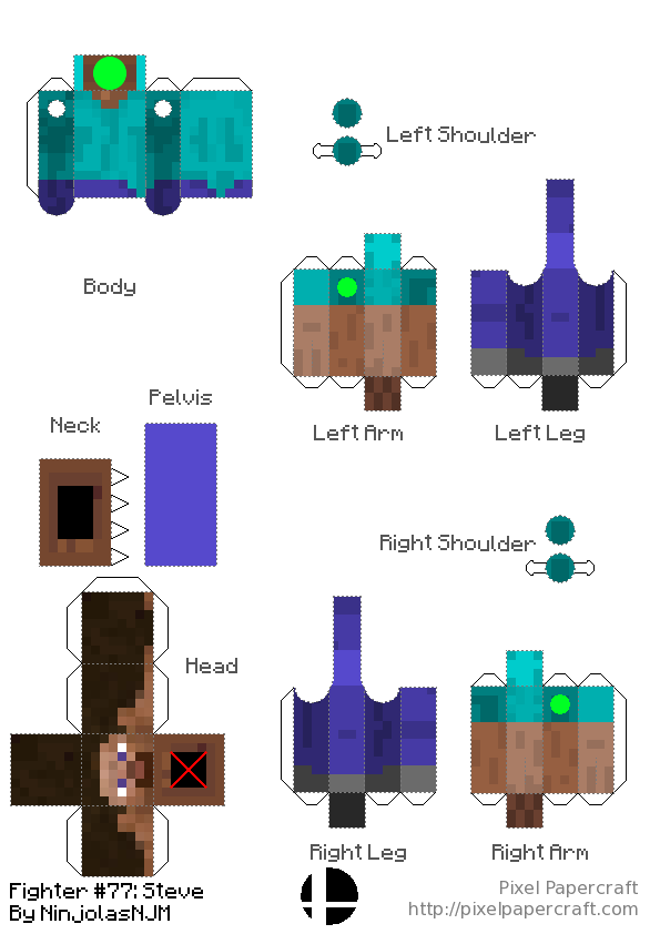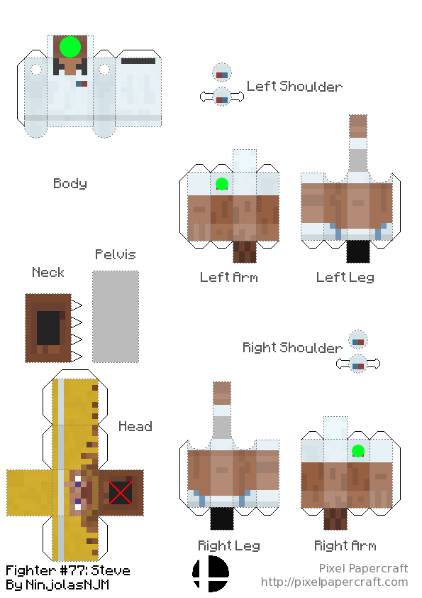 • Action Figures for all Steve alts in Smash. This action figure design has rotation in the neck, hips and shoulders, the same points that rotation occurs in game. It is a redesigned version of Umar Abid's design: https://www.pixelpapercraft.com/papercraft/5eb64ae99621be42cdc2a5ea/bendable-steve-no-toothpick I also made a generator for my design: https://www.pixelpapercraft.com/print/minecraft-action-figure