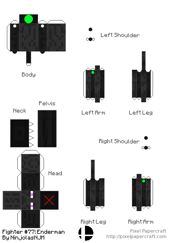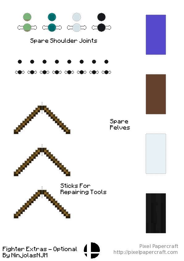 • An extras page, with spare parts for repairs or if you lose or break the original part while making the design. The Enderman shoulder joints specifically will really come in handy if you're like me and lost/broke 3 shoulder joints while making the enderman. The spare pelves don't have to be used as a replacement pelvis; they can also be used as the neck or be cut into any other part of the design you need to replace. Though there are no sticks in Smash, I included 3 of them here so you could use them to repair a broken tool if the handle comes off.