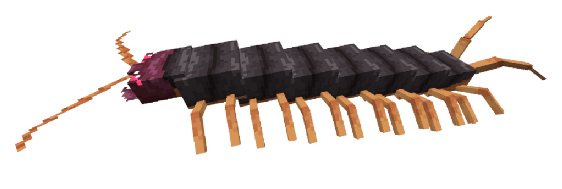 Cave Centipedes are long, and segmented into parts.The head is mostly a purple color, along with the mandibles, while the rest of the body is black. The legs and antenna on the contrary are an orange color. If going over a block, the Cave Centipede's segments slope.Cave Centipedes are hostile and strong, however this is countered by their slow mobility. Damaging any of the Cave Centipede's segment entities also deals damage to the head entity. Cave Centipedes attack via biting, which inflicts Poison II on targets for 10 seconds. Cave Centipedes target players and Cockroaches.