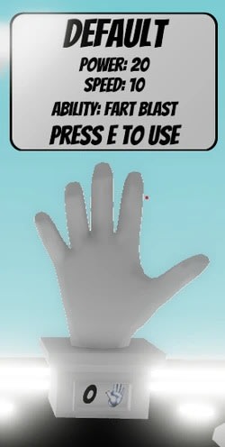 The Default Glove is the glove that everyone starts out with when first joining Slap Battles. It is a simple white glove. As the starter glove, it's not very good with only 20 power and 10 speed. Your glove is set to this in instances like Slap Competitions and entering the Default Arena portal. https://roblox-slap-battles.fandom.com/wiki/Default