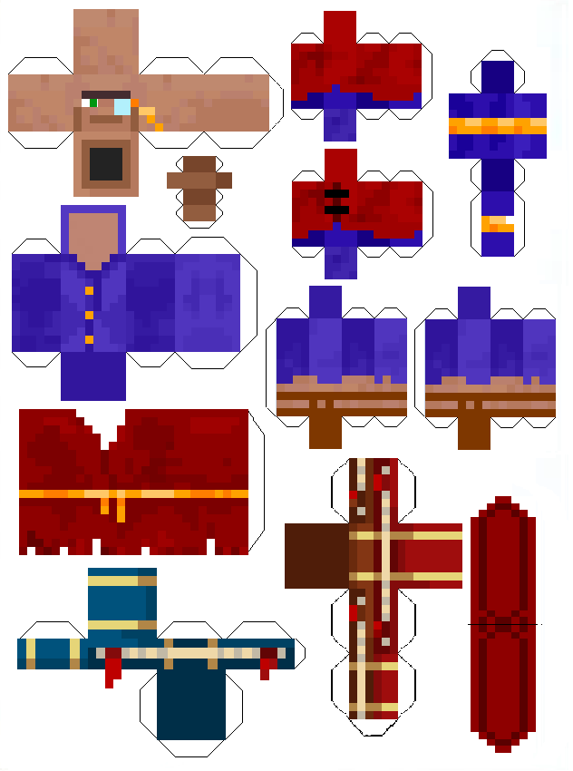 The first design for the enchantsmith was a merchant similar in looks to a librarian but instead of one book, it possessed three books atop its head, one blue, one red, and one brown. It wore a red robe with torn bottom ends, sleeves, and a cape, and a blue undershirt with gold rims around the sleeves and three yellow buttons. It also wore a gold belt and a monocle akin to a cartographer.