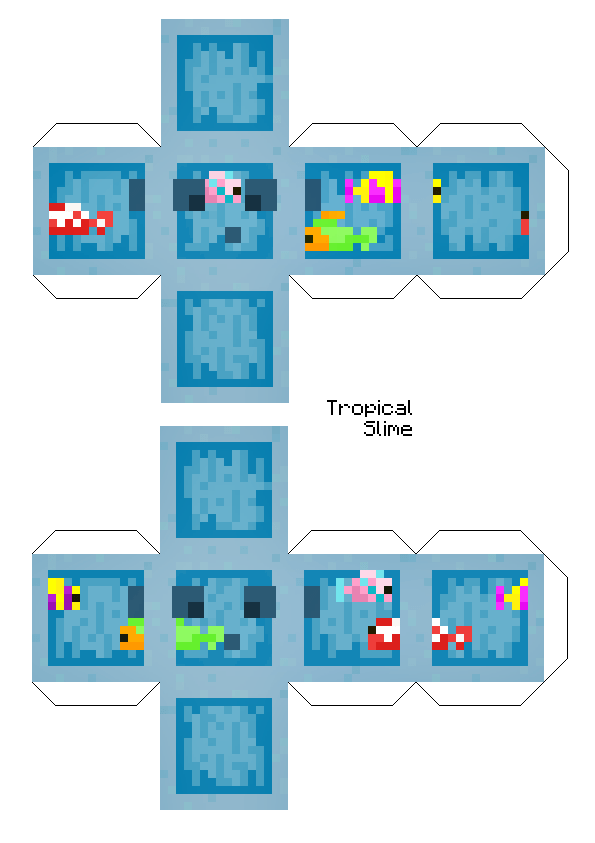 Tropical slimes are composed of water with two tropical fish swimming within it. Their eyes and mouth are dark blue and their body is brighter blue in color, while their outer layer is a lighter blue. Tropical slimes can split when defeated like slimes do. They have a unique ability where they grant the hero oxygen upon defeat. Medium tropical slimes don’t split when defeated, meaning that small tropical slimes can only exclusively spawn naturally in the mission. If a tropical slime is defeated on land, it will still play the sound and animation for oxygen refilling yet it will have no effect. https://minecraft.fandom.com/wiki/Minecraft_Dungeons:Tropical_Slime Photo by: Popopi
