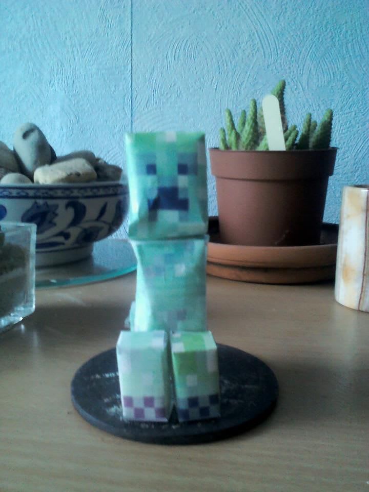 This is my little creeper I made, it was my first try so not so great. I accidently squished his face when I was ripping off cellotape. I named him Mr Astley. His legs fell off numerous times and it was quite difficult but next time, it'll be better I hope.