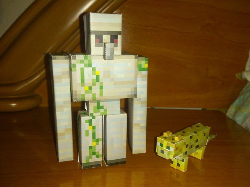 En honor a tonacho [ http://www.youtube.com/user/MinecraftZaragoza?feature=g-u-u ] y a Aeris, la gata del puto amo Alexelcapo [ http://www.youtube.com/user/alexelcapo?feature=g-u-u ] ( Publicidad gratuita ). You can print this papercraft desing here : 1) Ocelot : [ http://minecraftpapercraft.com/papercraft/4f489ed2cfeadbb12800000d/ocelot ] 2) Iron Golem : [ http://minecraftpapercraft.com/papercraft/4f49be3dddc091b21800000f/iron-golem ]