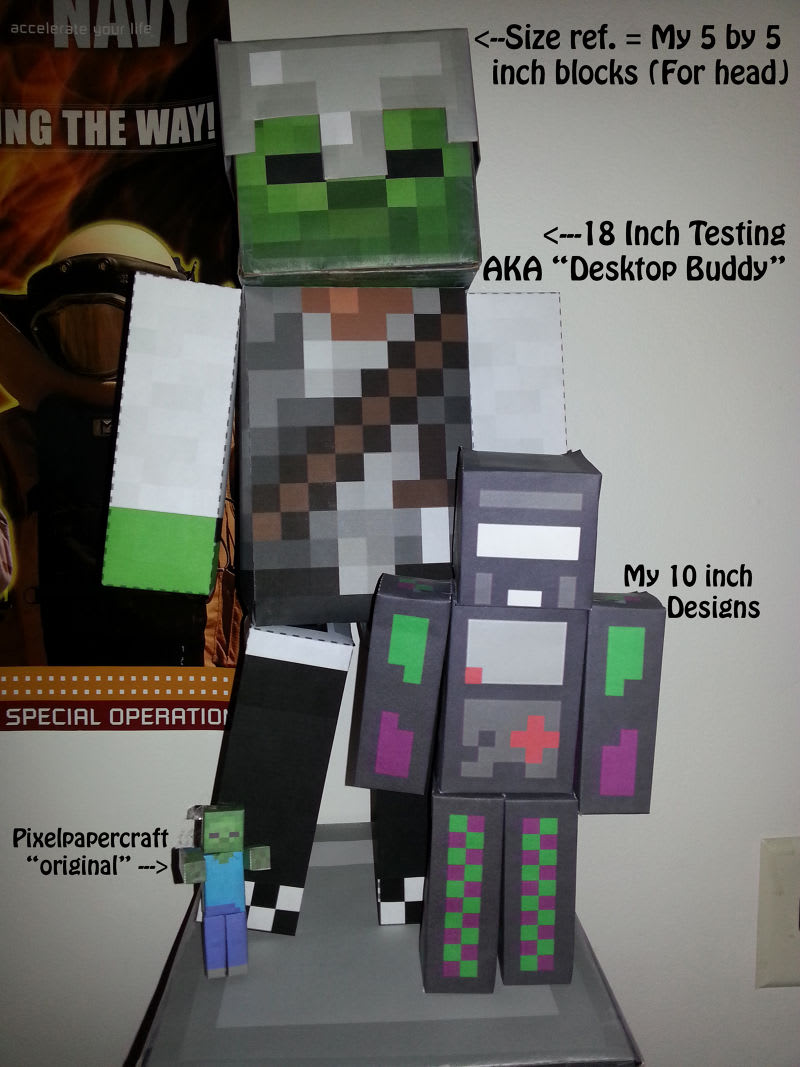 Hey guys, do i have a show for you. I call this 18 inch tall beast "Desktop Buddy". He is in the first couple stages of BETA right now, so it'll be a while before he's finished. The skins are random pieces cause of beta, so that wasn't the point. The head is based off of my 5 by 5 inch blocks, so i proportioned a body off of it. Each leg/arm costs a sheet of paper, each! The body costs 3. For prior/current requests on helmet design: I'll make it and "Reply" on your most current comment (Wherever it is) so you know it's done.
