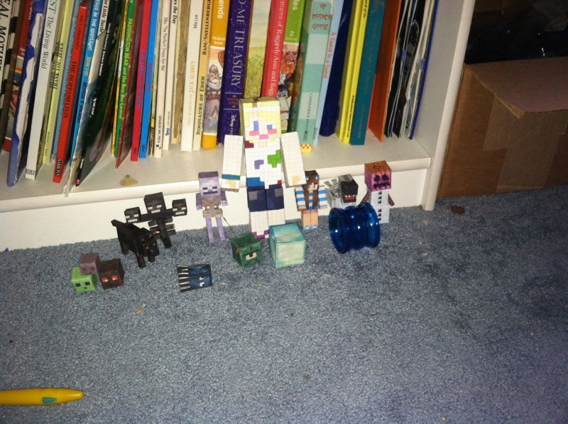 Hi! I used to make them for friends and then give them away... But then summer hit and school ended and now I am making them again! Yay! Anyways, here are my creations together: I have Lilly the black wolf, Squash the slime, Mini the magma cube, Pinkie the brain slime, Derp the squid, my unnamed and unfinished gaurdian, a diamond block, and a hamster tube to keep Nala the moa standing. Second row: I have Blizzard the snow golem, Nala the moa, Ellie the girl (named after my sis) Anna the graph paper girl, Bonnie the skeleton, and Molly the wither boss. Enjoy!