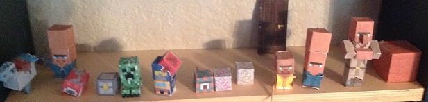 Left to right - Mini Arctic Moa, Mini Venusian Villager, Mini Lava Cow, Mini Iron Chest, Mini Advanced Creeper, Mini Soundwave, Mini Cheesy Guardian, 2 Mini Aether Ores, Mini Dave, Mini Advanced Venusian Villager, Archeologist Villager, Red Sandstone. A total of 13 approved papercrafts, and 12 photo'ed ones