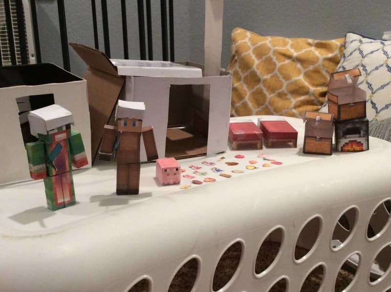 Here are the papercrafts I've made! As you can see the house IS NOT papercraft but my little people live in it. The green guy is UnspeakableGaming and the brown guy is ItsMooseCraft. If you watch either of them (on YouTube) tell me in the comments. The house has two floors. The chests DO open (if you can't see they do you might be in trouble) If you are wondering how I got the swords to stay I took rubber bands and in put the swords in. Also when my dad told me that regular paper was "to flimsy" to use I put paperboard (its what pop tart and cereal boxes are made of) on the inside. They took like 2 hrs each but it was worth it. Also the helmets I printed out that were supposed to fit them didn't so I create different my own template (printed ones were 2 cm. The one I made was 2 1/2 cm) and that's what's on there heads. Have a great day!