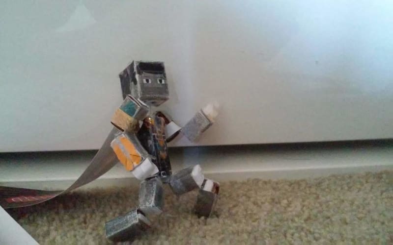 Just finished creating this yesterday. Like my previous model, this one also has a coat of nail polish and is capable of moving his joints. He's a bit more advanced because his head and arms can rotate 360 degrees and he's posable. I put layers of cardboard inside to strengthen him in case he's stepped on. The costume was made from bits of colored paper and stickers. You better watch out, Thanos!
