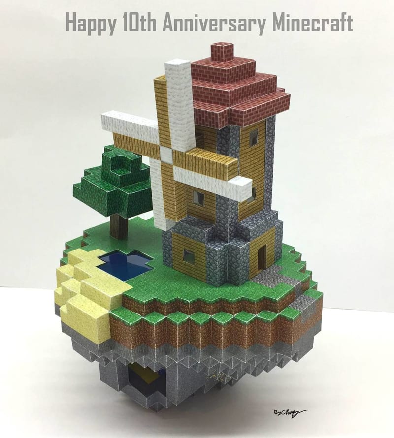 More photos and a better description about the design can be found here: http://www.pixelpapercraft.com/papercraft/5cd33beae1b9424cd32e628f/floating-minecraft-island-diorama-happy-10th-anniversary